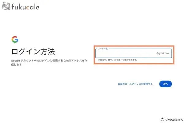 - Googleアカウントにログインするためのメールアドレスを設定する※Gmailアドレス以外のメールアドレスを使用することも可能です