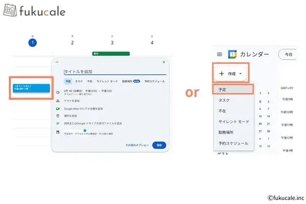 - 予定を入れたい[日付枠]か画面左上の[+作成]>[予定]を選択する