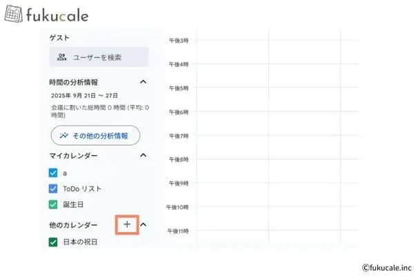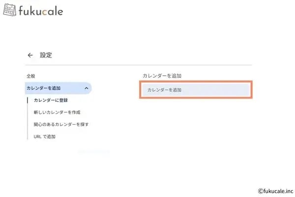 - Googleカレンダー左側メニューの「他のカレンダー」横にある[+]>[カレンダーに登録]をクリックする