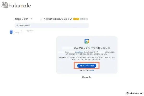 - Googleから届くメールを確認し、メール内の[共有カレンダーに参加]をクリックする※相手からアクセス権が付与されると届きます