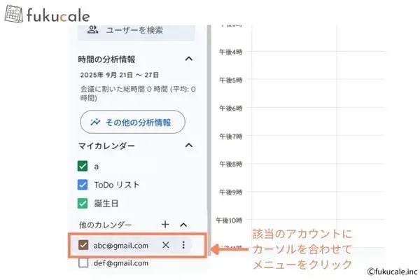 - 画面左の「他のカレンダー」の下に表示される「該当のアカウント名」にカーソルを合わせる
