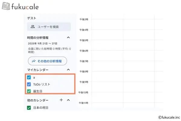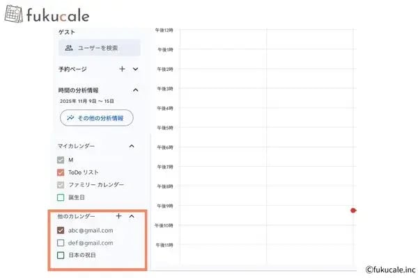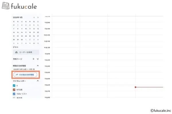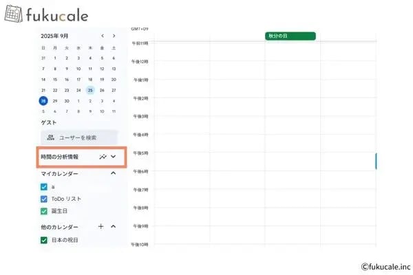 パソコンのブラウザでGoogleカレンダーを開いたら、画面左側の[時間の分析情報]をクリックします。