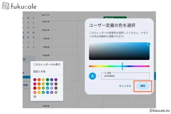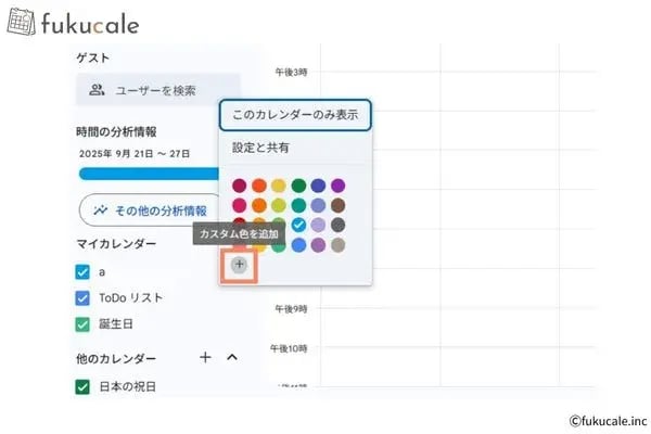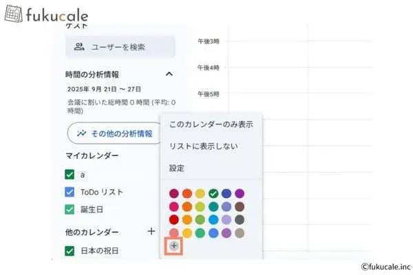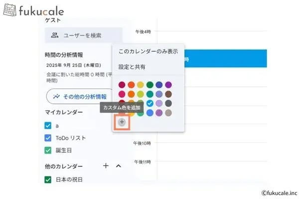Googleカレンダーでは、用意されている色に加え、カラーパレットでカスタムカラーを作成して自由に色を増やせます。