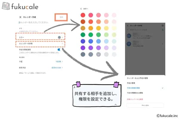 カレンダーの共有相手に付与できる権限の詳細は、以下の記事で解説しています。