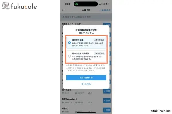 他の学生と共同編集(上書き許可) | 授業情報を上書きすると、「共同編集」を選んでいるほかの学生にも内容が反映される |
