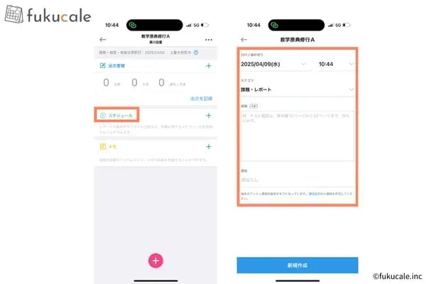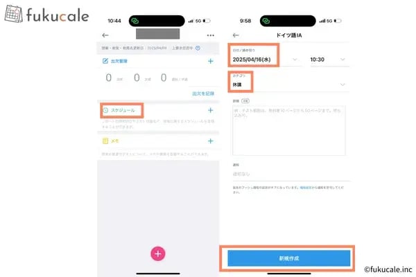 メモを書き込める詳細欄があり、テストやレポートの範囲、当日の注意事項などもあわせて記録できます。