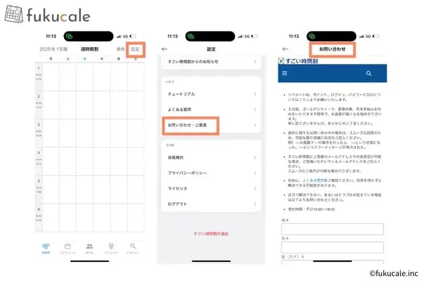登録後、画面右上の[設定]から[お問い合わせ・ご意見]をタップし、自分の大学が表示されない件について問い合わせてみましょう。