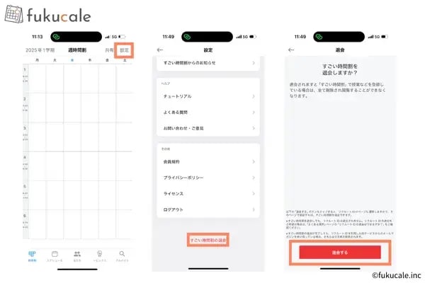 アプリ画面右上の[設定]をタップし、画面の最下部にある赤文字の[すごい時間割の退会]を選択すると、退会手続きができます。