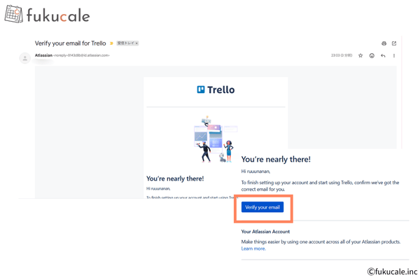 - 登録したアドレスに「Atlassian」から届くメールを開き、[Verify your email]をクリックする