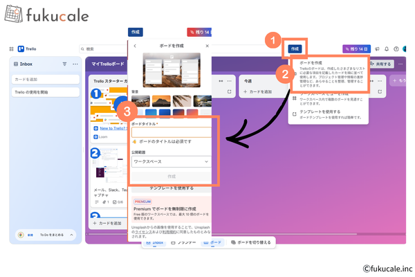 - 「ボードタイトル」と公開範囲(公開・ワークスペース・非公開)を設定し、[作成]をクリックする