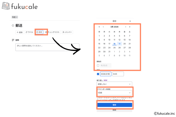 - 通知を送るタイミング(例:1日前)を設定し、[保存]をクリックする