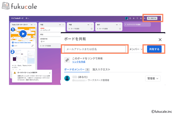 ボード単位でメンバーを招待する手順は、以下の通りです。
